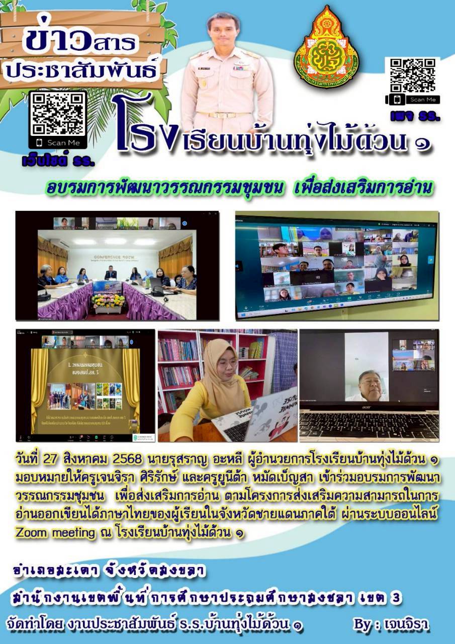 วันที่ 27 สิงหาคม 2568 นายรุสราญ อะหลี ผู้อำนวยการโรงเรียนบ้านทุ่งไม้ด้วน ๑ มอบหมายให้ครูเจนจิรา ศิริรักษ์ และครูยูนีต้า หมัดเบ็ญสา เข้าร่วมอบรมการพัฒนาวรรณกรรมชุมชน เพื่อส่งเสริมการอ่าน ตามโครงการส่งเสริมความสามารถในการอ่านออกเขียนได้ภาษาไทยของผู้เรียนในจังหวัดชายแดนภาคใต้ ผ่านระบบออนไลน์ Zoom meeting ณ โรงเรียนบ้านทุ่งไม้ด้วน ๑