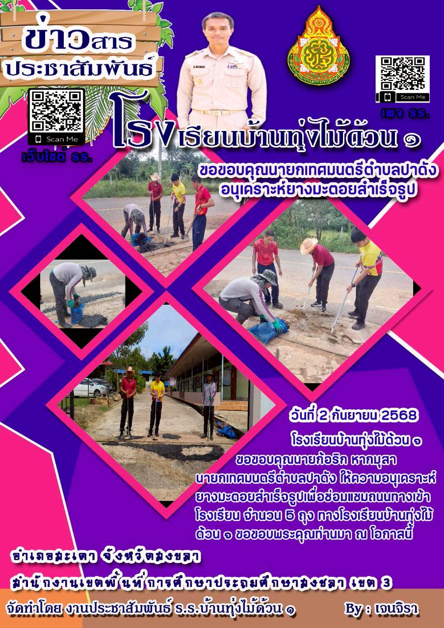 วันที่ 2 กันยายน 2568 โรงเรียนบ้านทุ่งไม้ด้วน ๑ ขอขอบคุณนายก้อริก หากมุสา นายกเทศมนตรีตำบลปาดัง ให้ความอนุเคราะห์ยางมะตอยสำเร็จรูปเพื่อซ่อมแซมถนนทางเข้าโรงเรียน จำนวน 5 ถุง ทางโรงเรียนบ้านทุ่งไม้ด้วน ๑ ขอขอบพระคุณท่านมา ณ โอกาสนี้